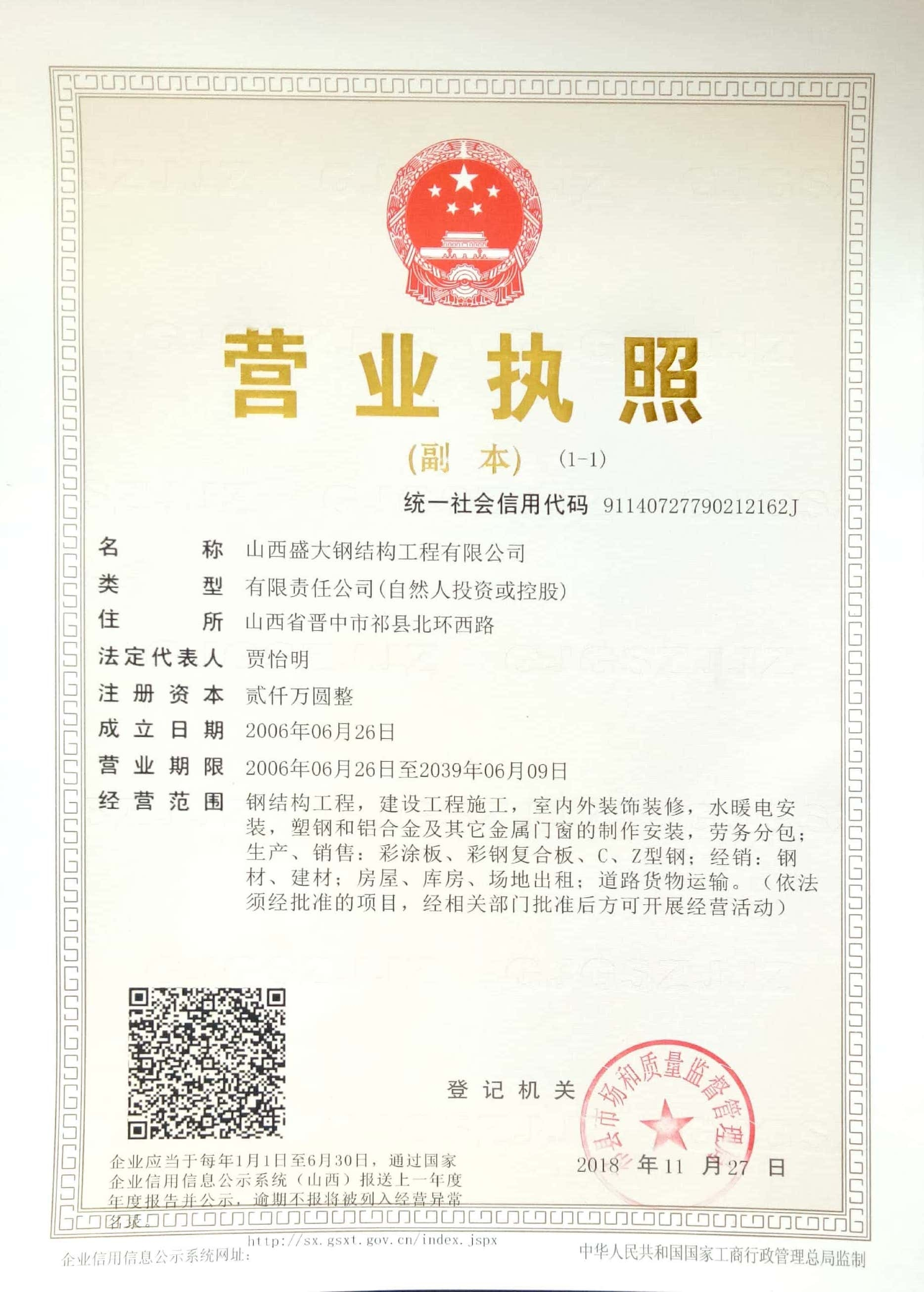 山西盛大鋼結(jié)構(gòu)工程有限公司 山西盛大鋼結(jié)構(gòu)工程有限公司成立于1996年,坐落于國(guó)家歷史文化名城——山西祁縣。擁有兩大智能化鋼結(jié)構(gòu)生產(chǎn)基地,占地110畝,建筑面積3萬(wàn)余平方米,具備鋼結(jié)構(gòu)專(zhuān)業(yè)承包貳級(jí)、建筑工程施工總承包貳級(jí)資質(zhì),是一家集設(shè)計(jì)、制造、施工于一體的大型鋼結(jié)構(gòu)工程企業(yè)。 盛大鋼構(gòu)是中國(guó)鋼結(jié)構(gòu)協(xié)會(huì)會(huì)員單位,山西鋼結(jié)構(gòu)協(xié)會(huì)副會(huì)長(zhǎng)單位,山西建筑企業(yè)商會(huì)理事單位,山西省土木建筑學(xué)會(huì)會(huì)員單位,擁有國(guó)家知識(shí)產(chǎn)權(quán)局注冊(cè)商標(biāo)。公司已通過(guò)ISO9001質(zhì)量管理體系認(rèn)證,體系覆蓋鋼結(jié)構(gòu)加工與施工等核心… more +