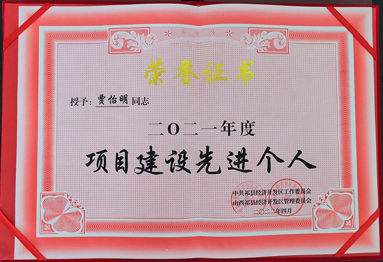 公司董事長賈怡明同志,在2021年開發(fā)區(qū)項(xiàng)目建設(shè)先進(jìn)表彰大會上,被中共祁縣經(jīng)濟(jì)開發(fā)區(qū)工作委員會和山西祁縣經(jīng)濟(jì)開發(fā)區(qū)管理委員會共同授予“二〇二一年度項(xiàng)目建設(shè)先進(jìn)個(gè)人”榮譽(yù)稱號。